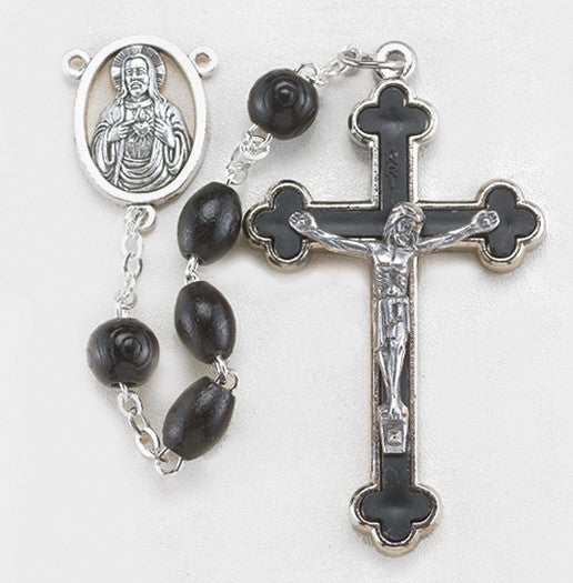 8x10mm Black Oval Wood Bead Rosary with Carved Pater Beads and Silver Oxidized Center with Large Inlayed Crucifix. 23"