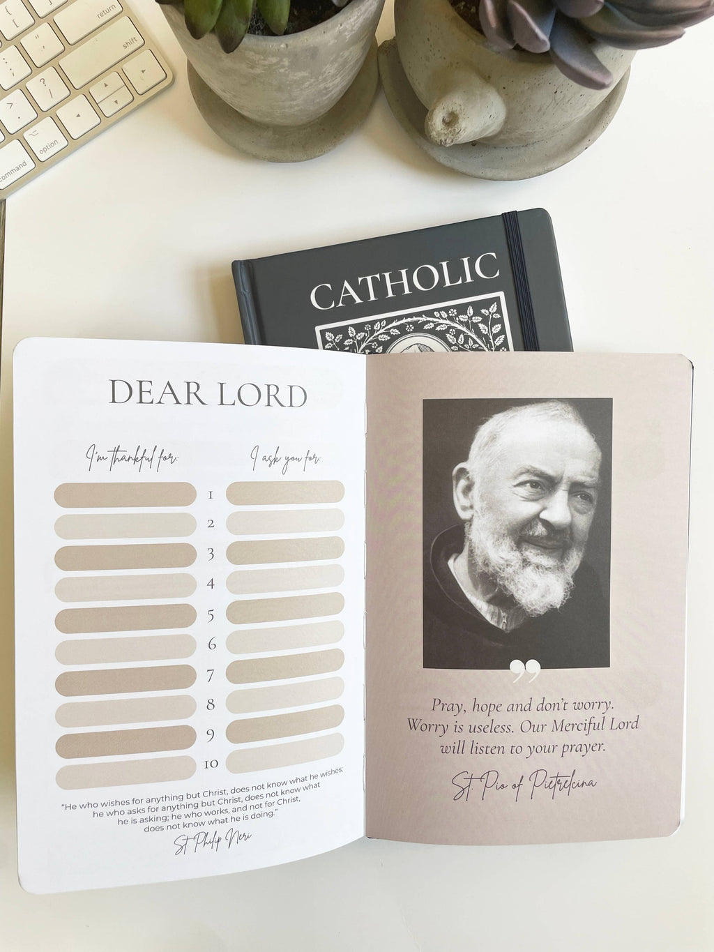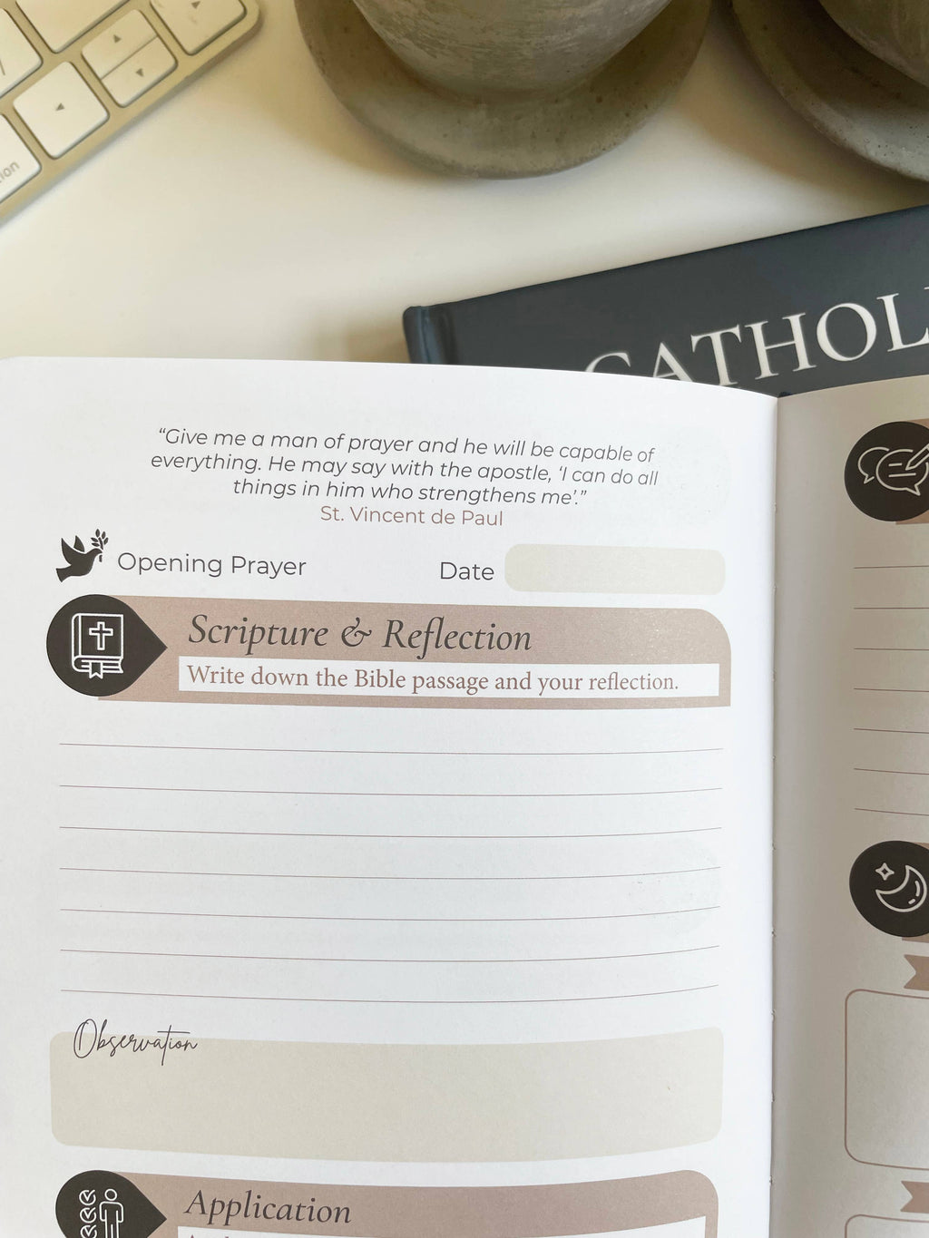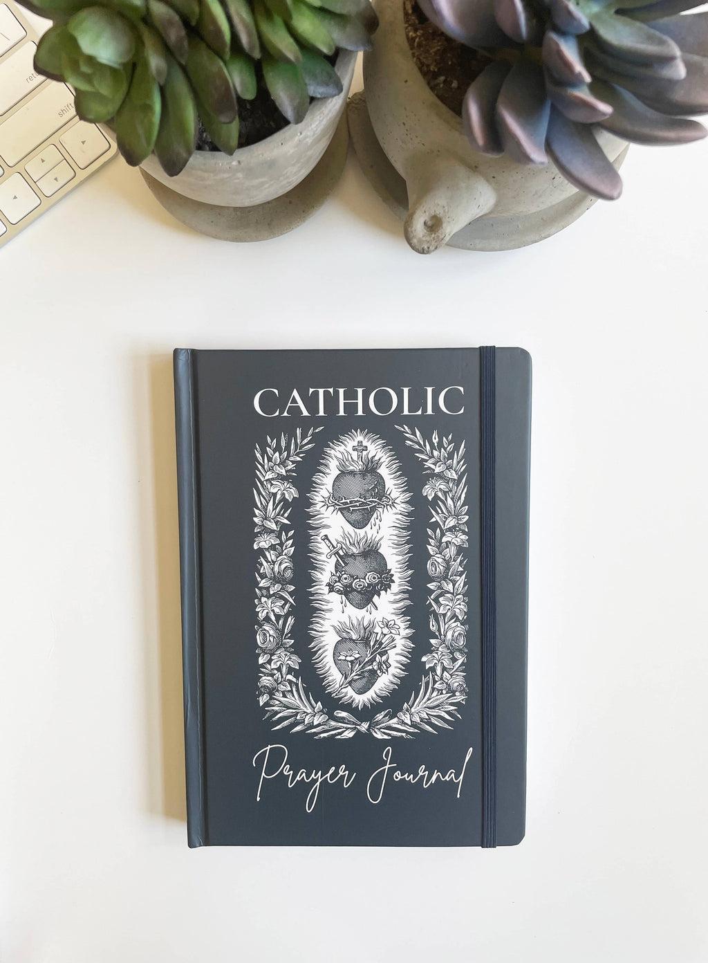 This Catholic Prayer Journal is a 3 month guided devotional through Scripture and the Saints. The journal includes Bible verses and quotes from the Saints to help you get closer to Christ. It includes the following: For every day, entries for: - Scripture and reflection. - Application to your life. - Personal prayer. For every night: -The Examen of St. Ignatius of Loyola with entries for gratitude, grace, review, repent and resolve. Journal pages with plenty of room to write. Bible verses and quotes from the Saints on every spread. Beautifully illustrated interiors and prayer spaces. The Catholic Prayer Journal also includes weekly pages for thanksgiving and petitions, a complete guide on how to pray the Rosary and 3 pages with novena tracker formats. Size: 6x8.5 inches Matte hard cover with elastic band. Lays flat. You can choose between 2 covers: - 3 Sacred Hearts - Immaculate Mary