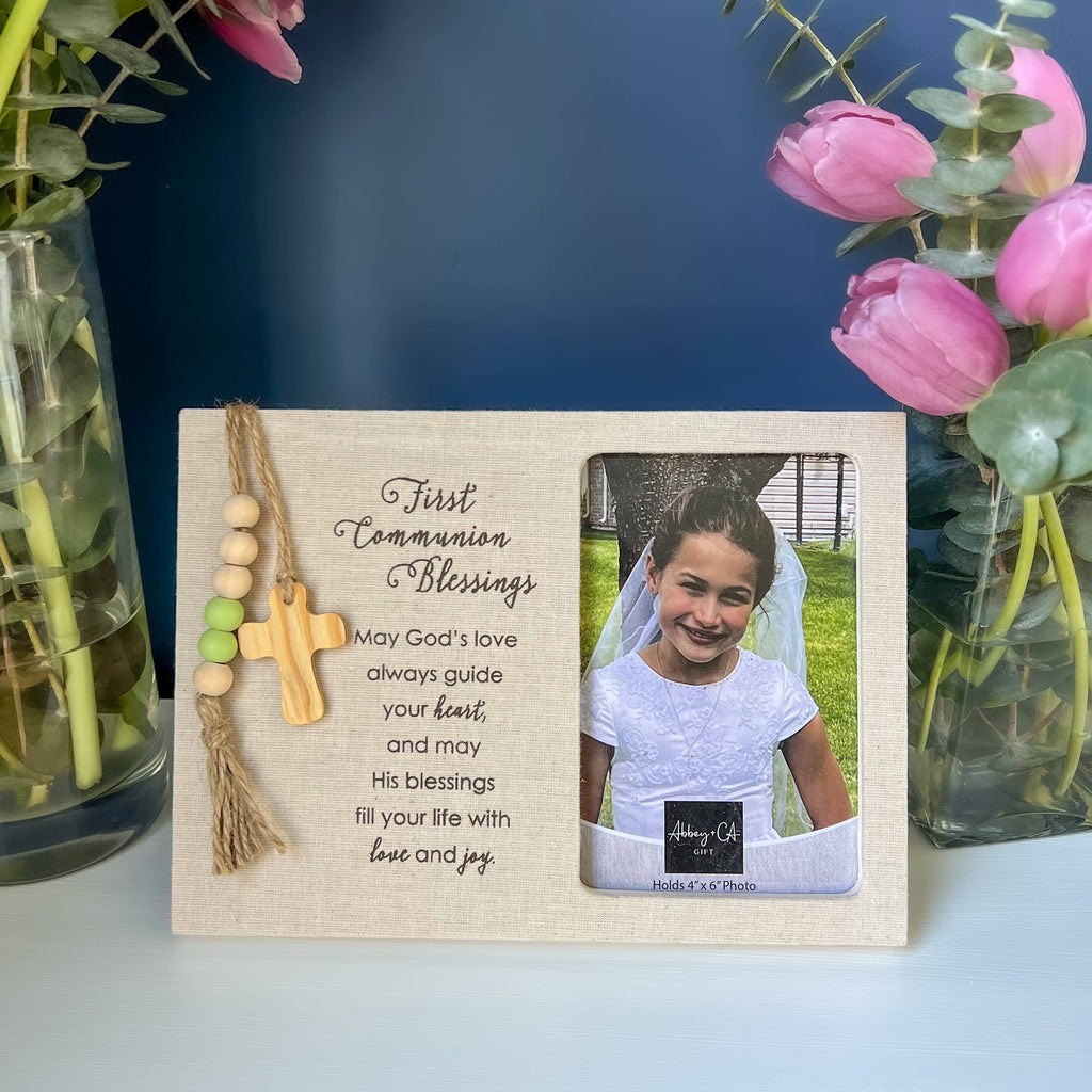 This keepsake frame features the meaningful Communion sentiment “First Communion Blessings May God’s love always guide your heart and may His blessings fill your life with love and joy.” Crafted of MDF and wrapped in fabric. Adorned with jute, wood cross charm and beads. Holds 4” x 6” photo. Ready to hang or stand. 6 ½” H x 9”W. Boxed.