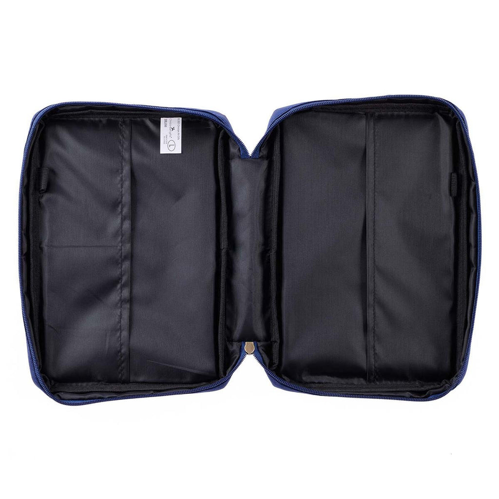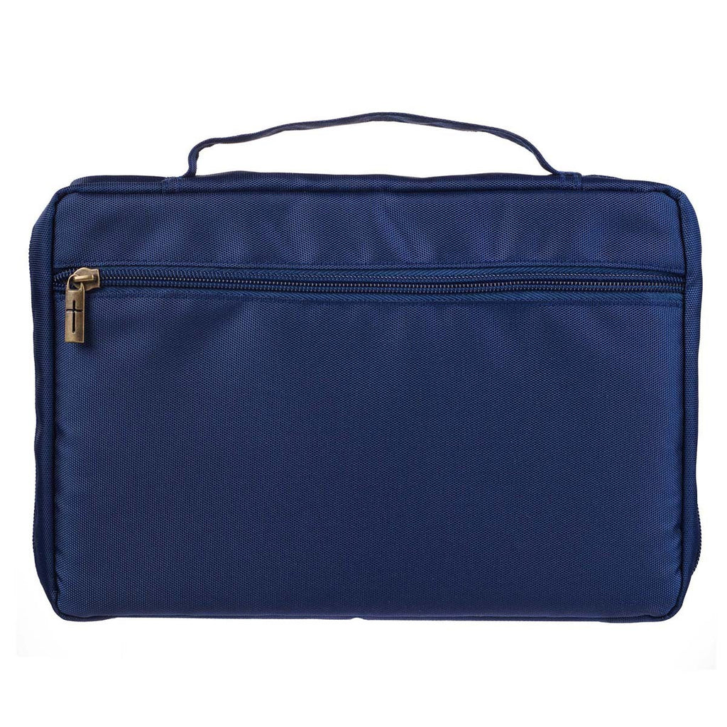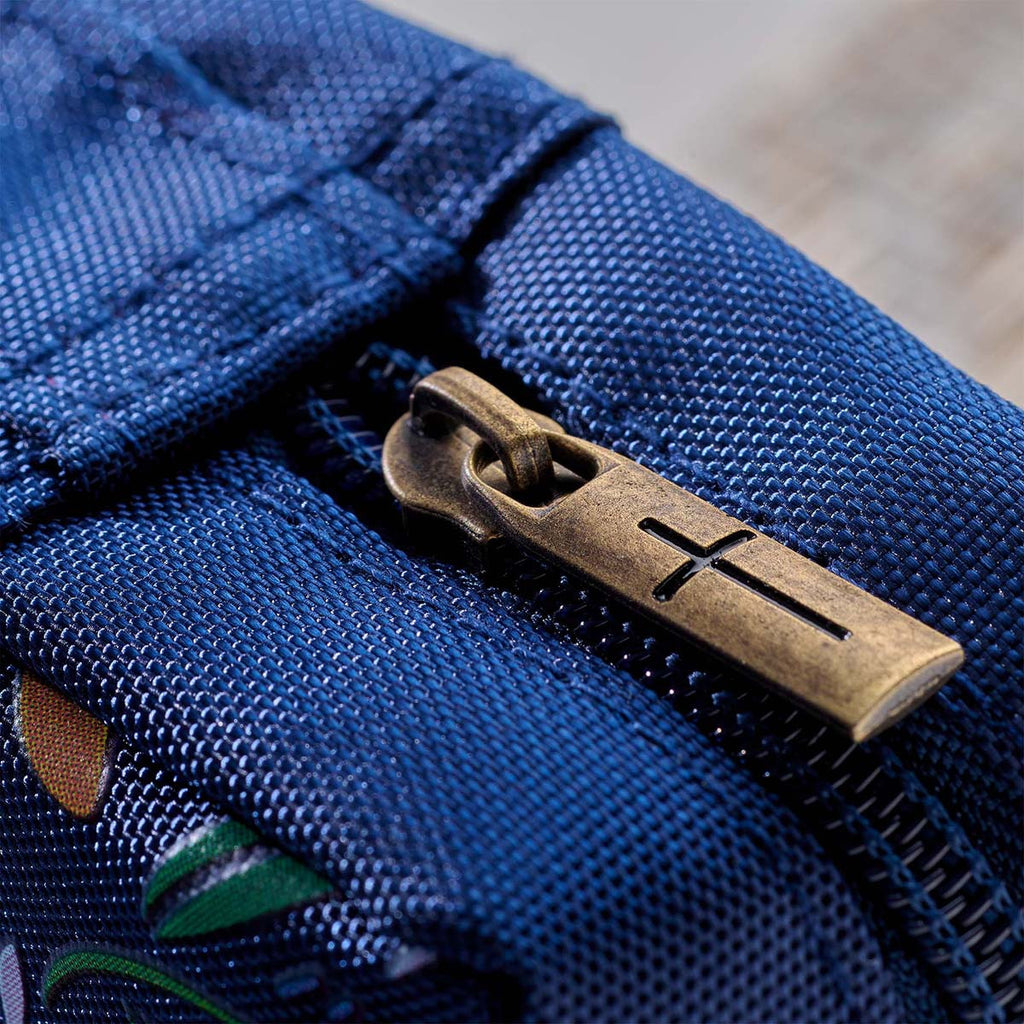 A spine handle, constructed from the same durable fabric, allows the Bible cover to open completely flat when in use. The sturdy navy zipper with an antique gold zipper pull keeps all contents securely inside. An exterior zip pocket, also with an antique zipper pull, is added to the back panel to store things like notes or church bulletins. Inside are two slip pockets that hold the Bible's outer covers and two pen loops that allow for easy access to a pen and highlighter.