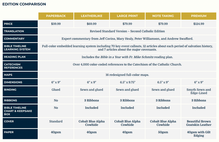 The Premium version of The Great Adventure Catholic Bible, Second Edition comes with a fold-out, keepsake box and a free copy of The Bible Timeline Chart.