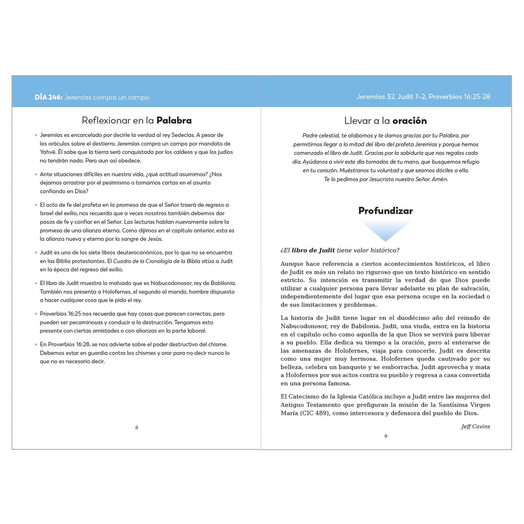 Además del contenido de todos los días, cada periodo de tiempo cuenta con una Introducción y un Repaso. Escritos por Jeff Cavins, estos te ayudarán a saber qué debes buscar en los días siguientes y a recordar lo que aprendiste en el periodo que acabas de terminar.