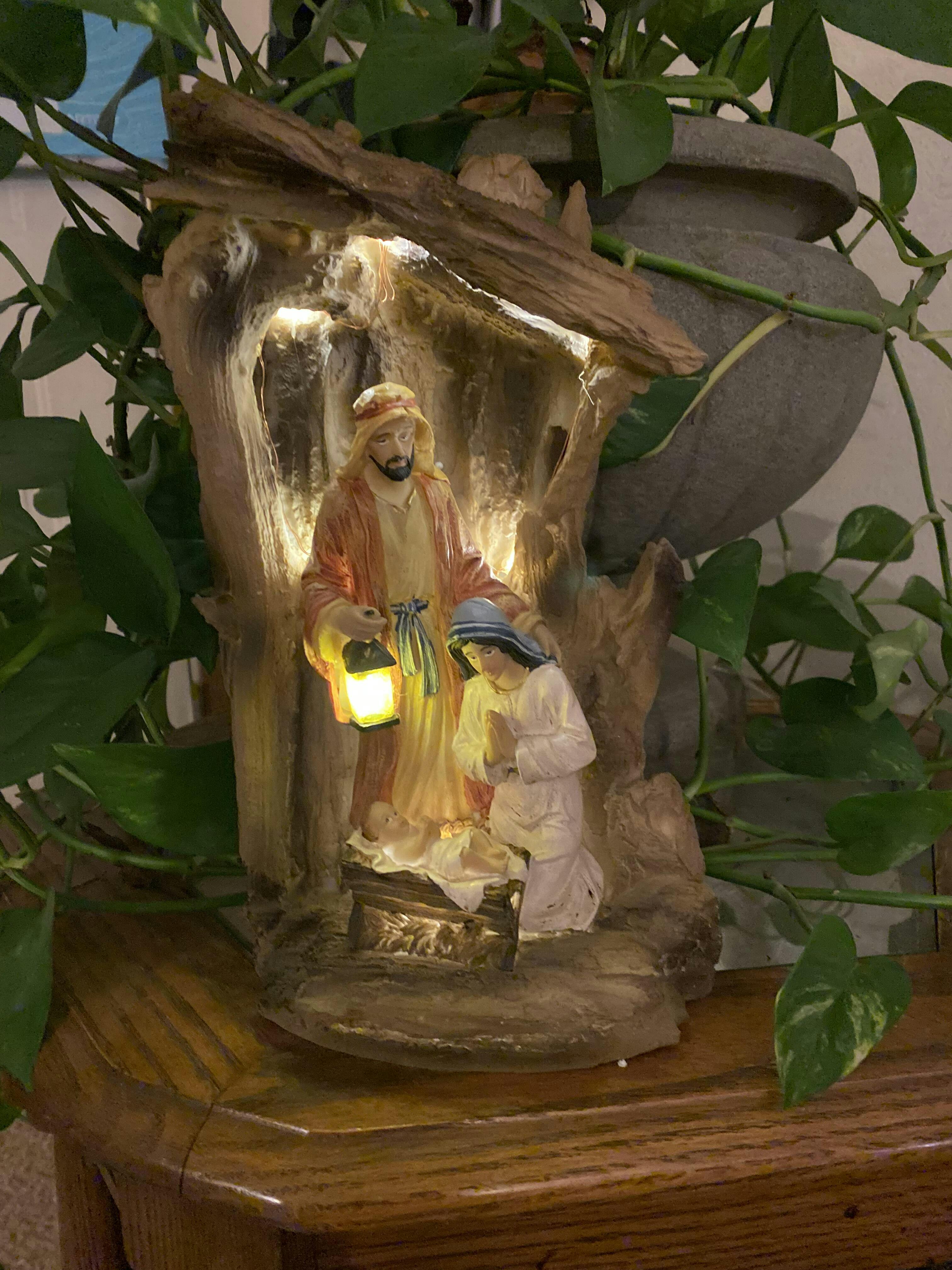 Lighted Holy Family Joseph holds a lighted lantern illuminating the infant Jesus in the manger as Mary prays reverently over her newborn son. Set in a rustic stable scene with soft back lights that gently illuminate this beautiful setting. The intricate detail and beautiful facial expressions bring the Holy Family to life and make a special Christmas display.