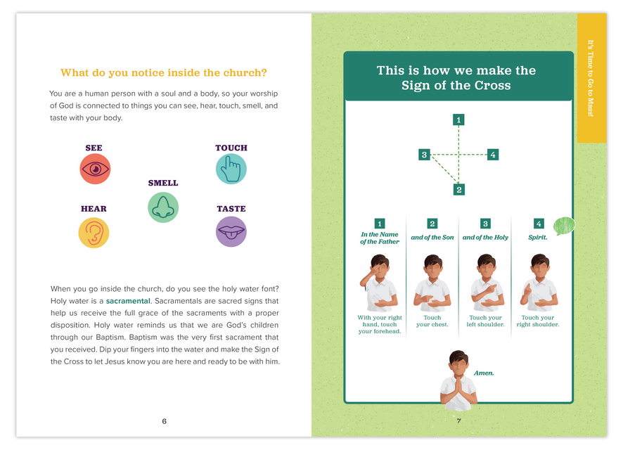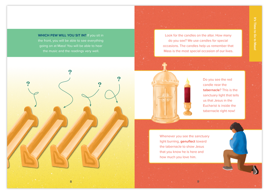 Receiving Jesus: My Guide to the Mass helps children become comfortable going to Mass by showing them not only when to sit, stand, and kneel and what to say but also why we do the things we do at Mass. They’ll learn about the roles of the different people they see at Mass, like the ushers, lectors, cantors, deacons, and priests. This is the perfect book for them to bring to Mass!