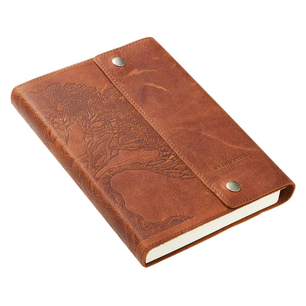 Take notes or document your day in style and be reminded to stay the course every time you reach for this handsome full grain leather journal. An etching of a tree heat-debossed on the cover offers a subtle echo of the message taken from Philippians 4:1 debossed on the flap: “STAND FIRM IN THE LORD.” Metal snap buttons and tidy stitching pull together the classic, masculine tone of this journal. A great gift idea for any occasion!